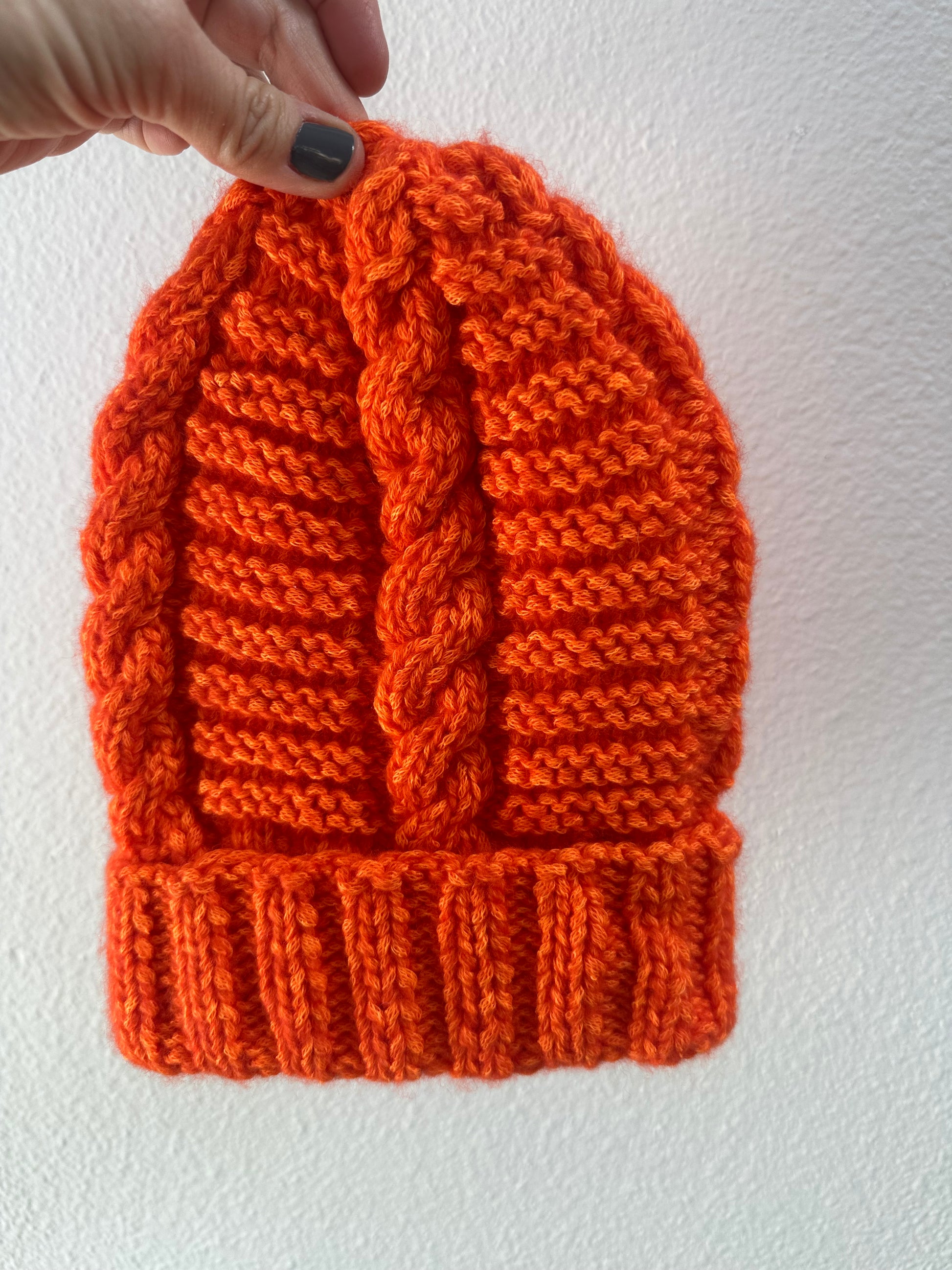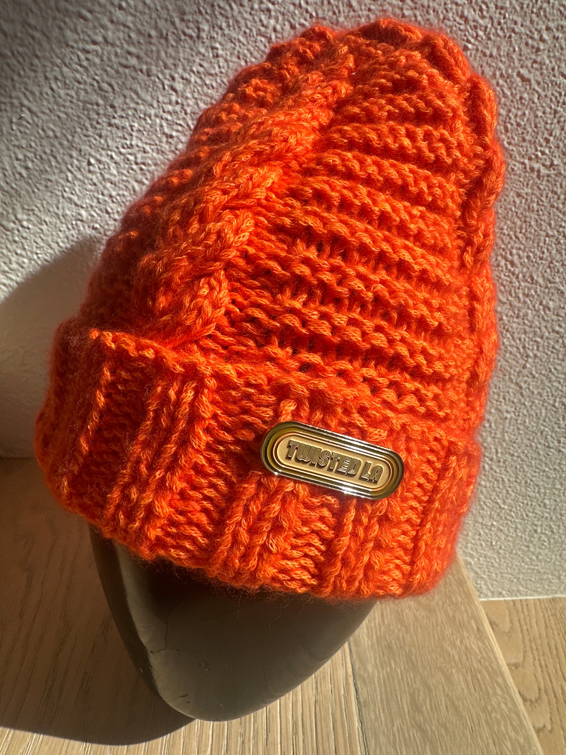 Hand knit wool and recycled plastic this chunky cabled orange number will keep you warm and cozy without needing to sit by a fire.